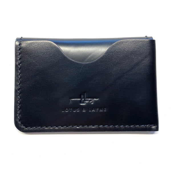 This Buffalo wallet is handcrafted from world famous Horween Shell Cordovan leather. The Buffalo wallet is a two pocket design with a flap closure. One slot under the flap, and one on the back for easy access to your most used card. It will age darker over time, burnishing in spots of high wear and will develop a beautiful patina.