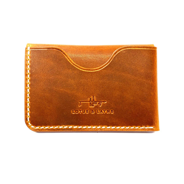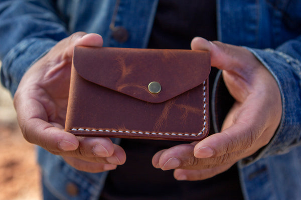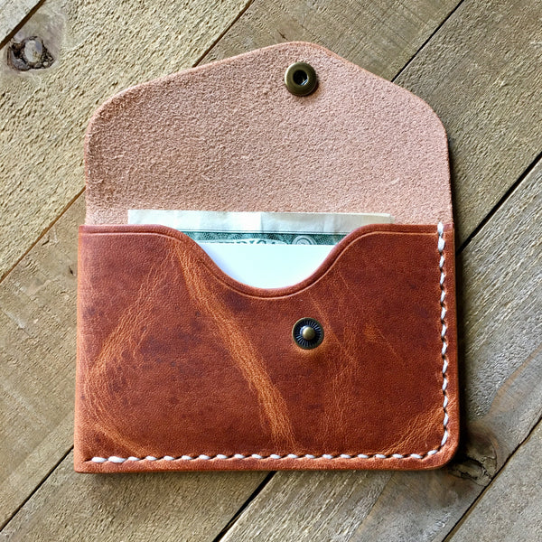 This Buffalo wallet is handcrafted from world famous Horween Dublin leather. The Buffalo wallet is designed with two pieces of leather wrapped around each other to create a pocket under the flap and a outer pocket on the back side. One side of the wallet is unstitched to allow for expansion on the inside or outside pocket. It will also develop a beautiful patina by burnishing in spots of high wear and will only get better as it ages.